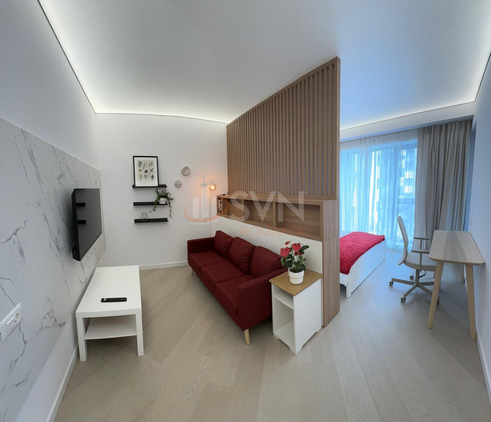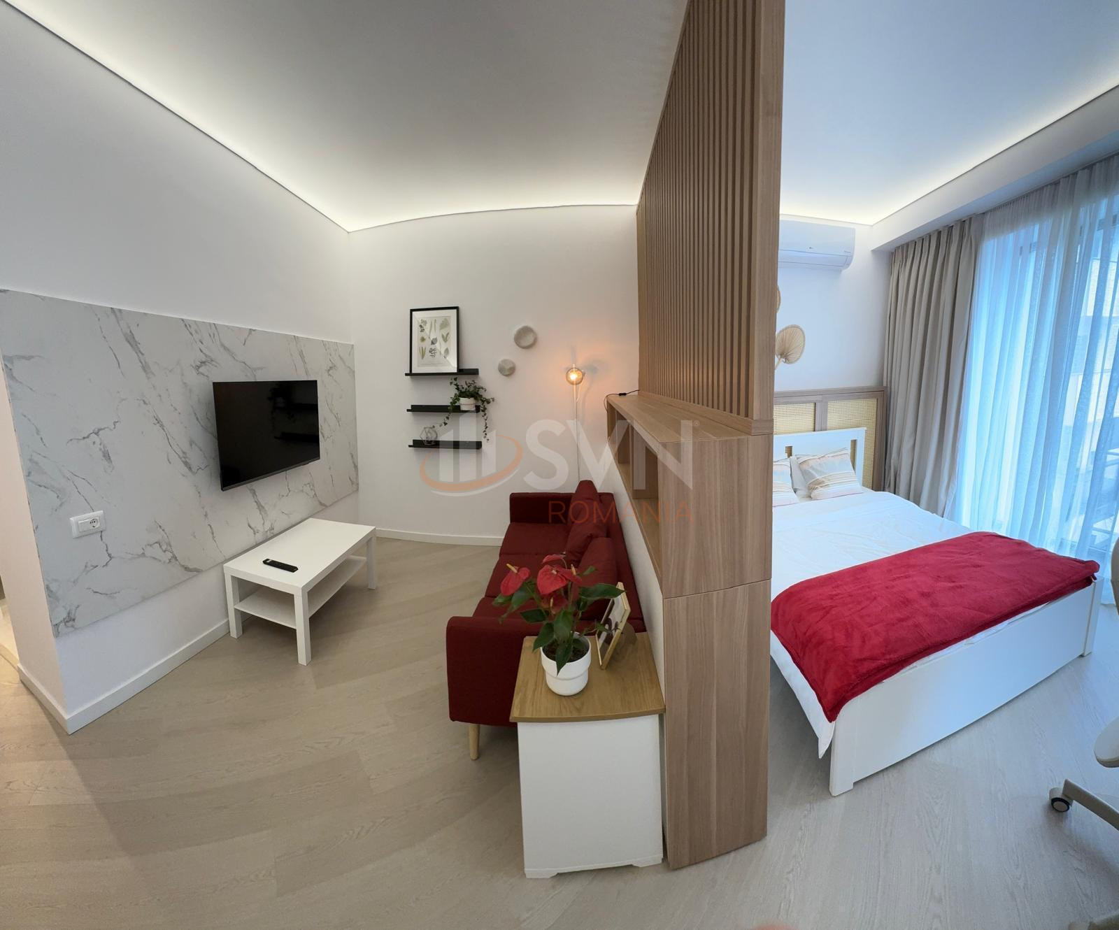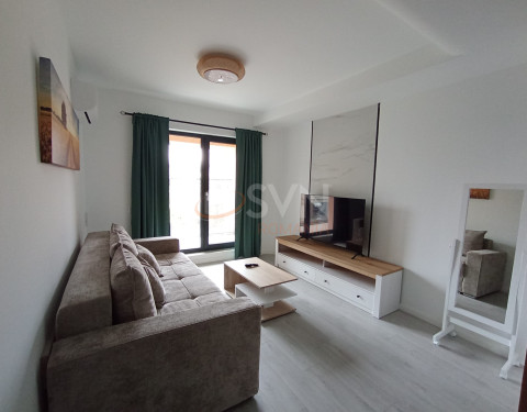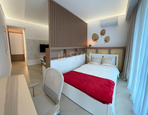Studioul este amenajat cu pat dublu,cu somiera si cu saltea Air Gel foarte confortabil, o canapea extensibila cu sistem clic-clac, foarte usor de folosit la nevoie, spatiu special amenajat pentru birou si balcon frantuzesc. In camera veti gasi un Smart TV si un AC. Geamurile Reynaers High End ofera izolare termica si fonica exceptionale. Camera este dotata cu perne, plapuma, lengerie - toate sunt noi