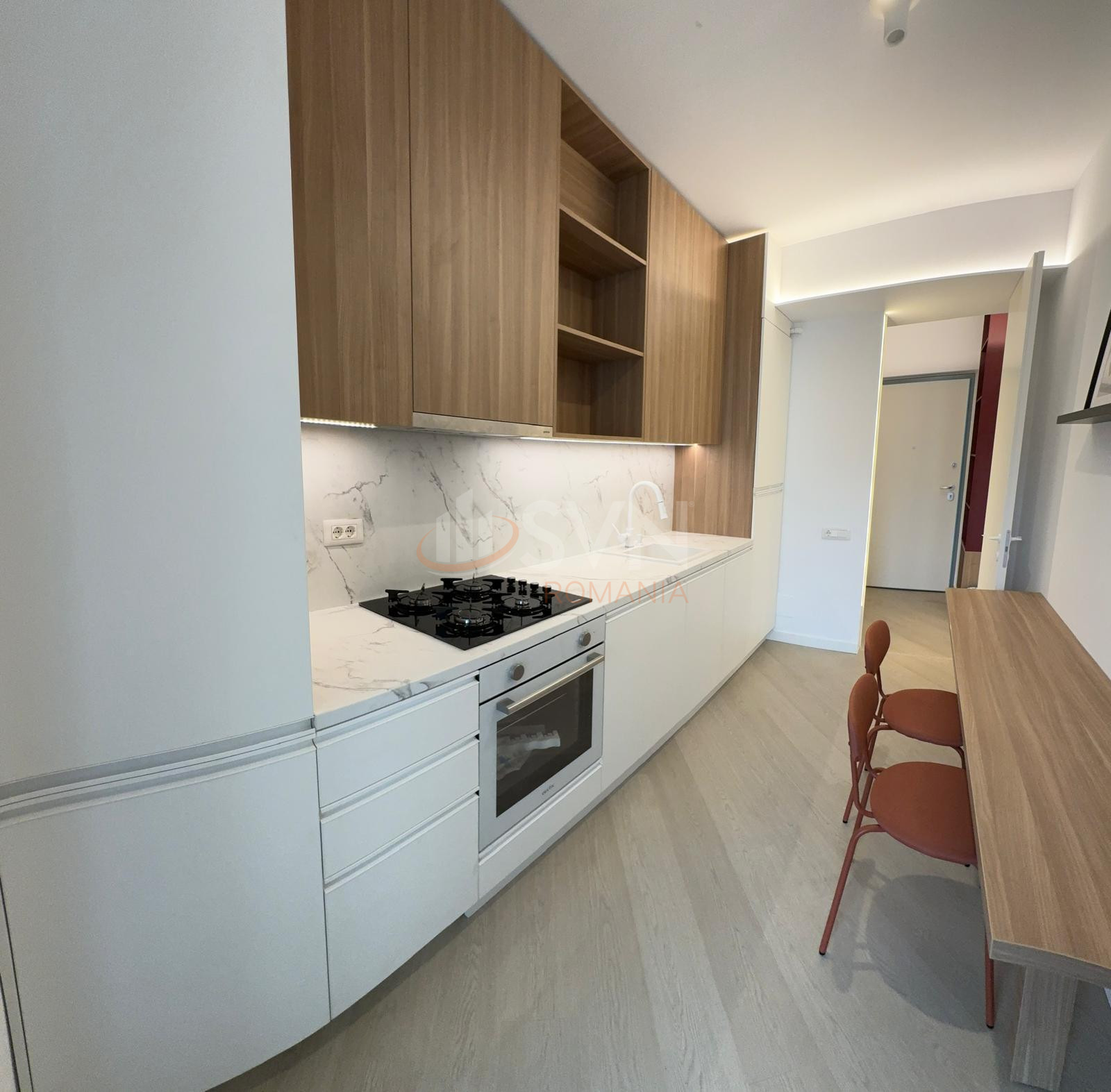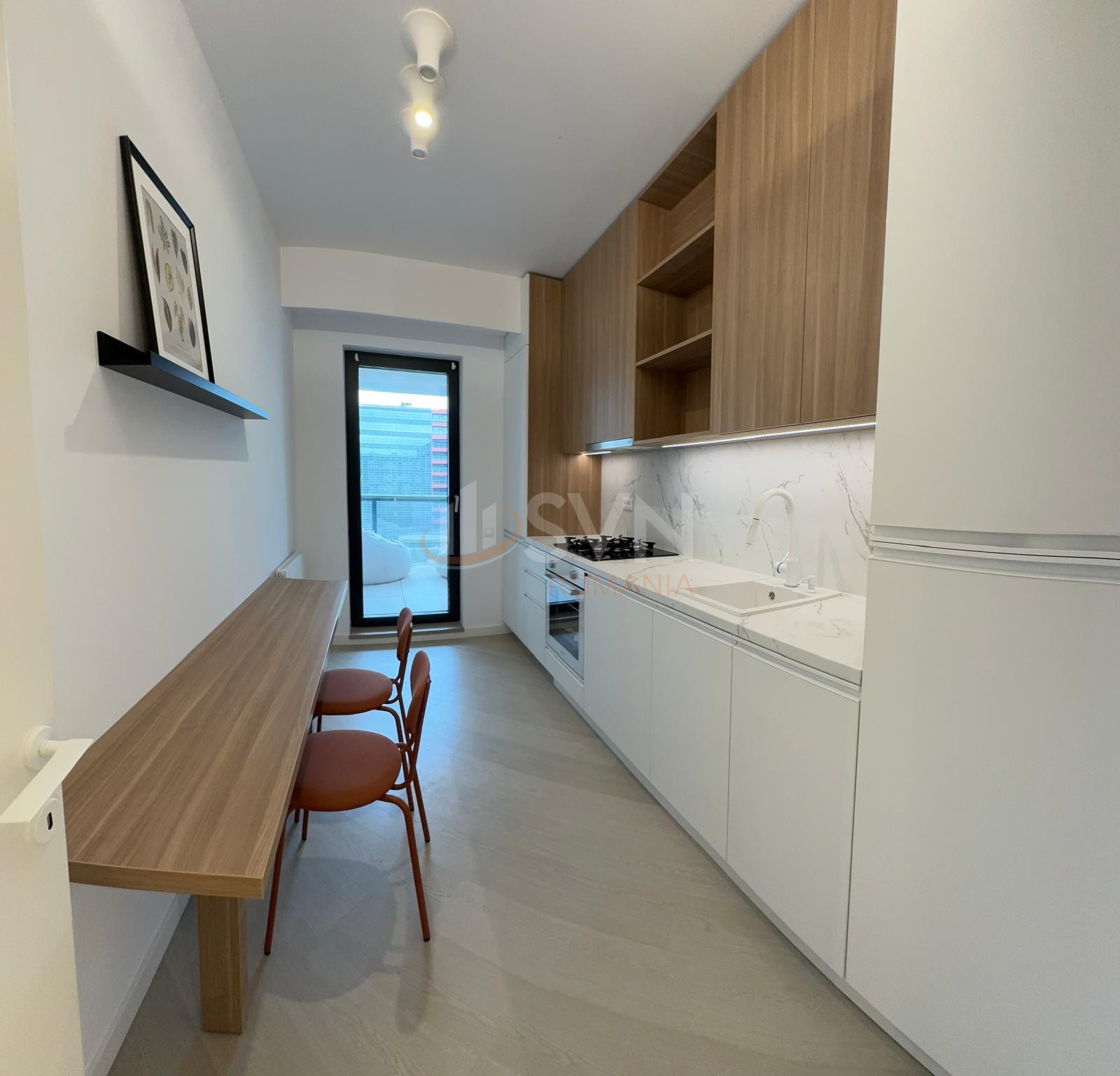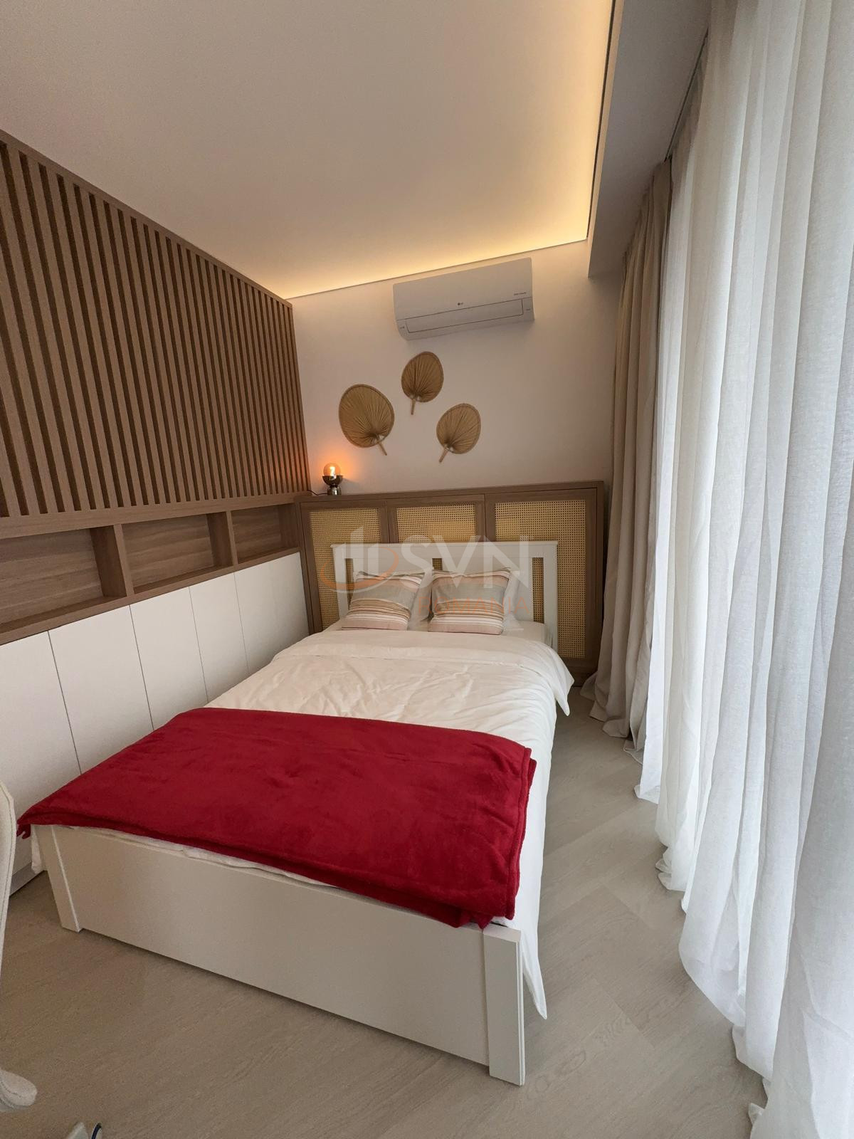 Studioul este amenajat cu pat dublu,cu somiera si cu saltea Air Gel foarte confortabil, o canapea extensibila cu sistem clic-clac, foarte usor de folosit la nevoie, spatiu special amenajat pentru birou si balcon frantuzesc. In camera veti gasi un Smart TV si un AC. Geamurile Reynaers High End ofera izolare termica si fonica exceptionale. Camera este dotata cu perne, plapuma, lengerie - toate sunt noi