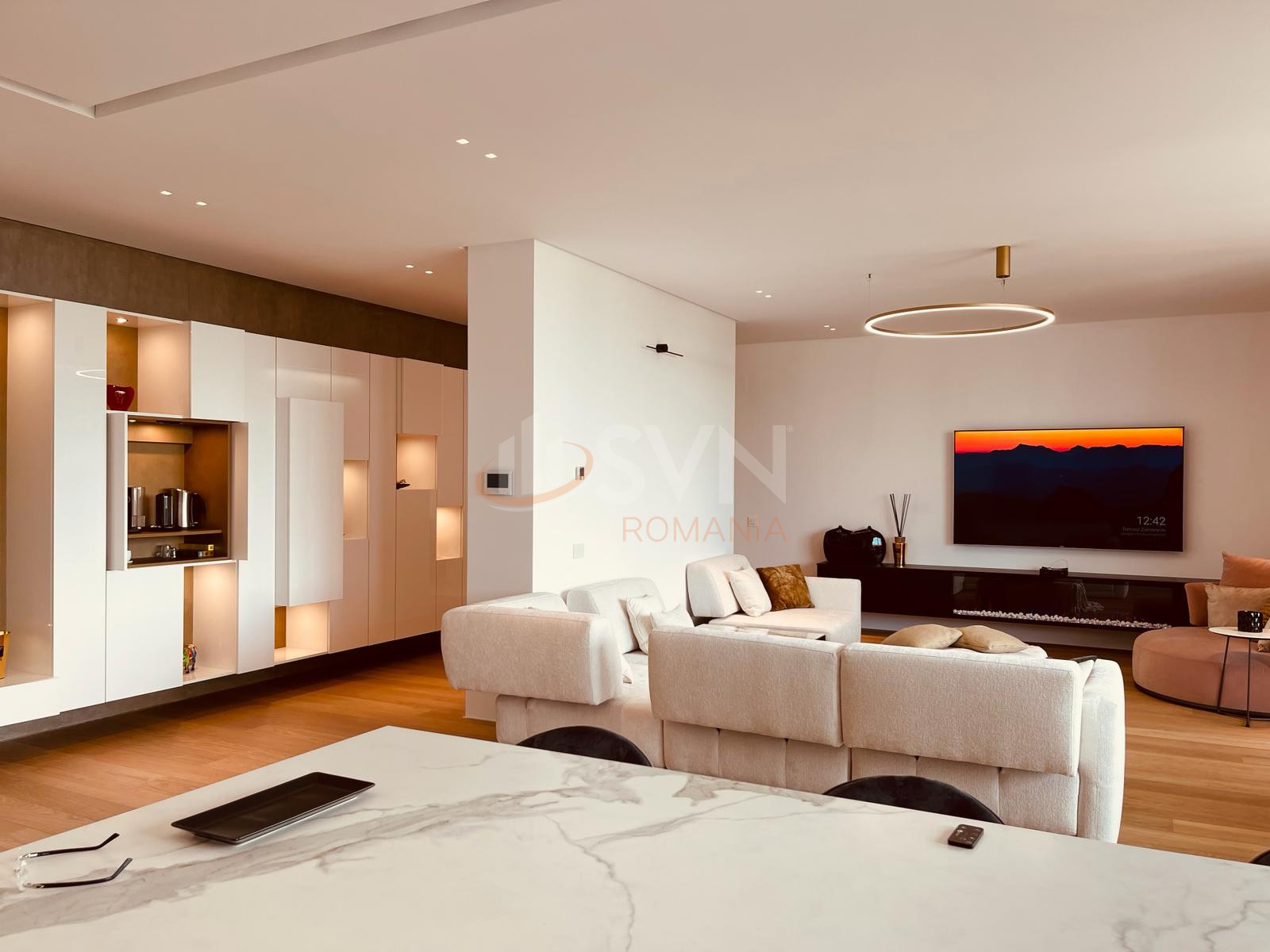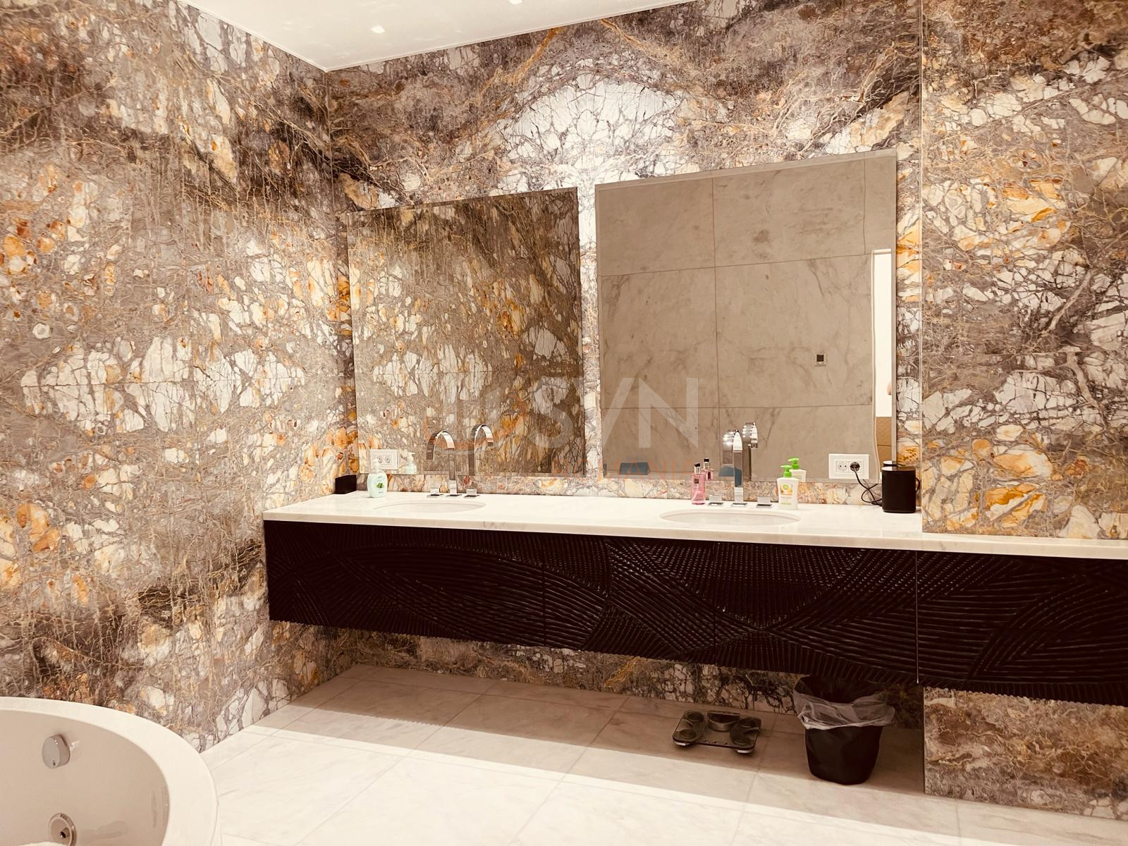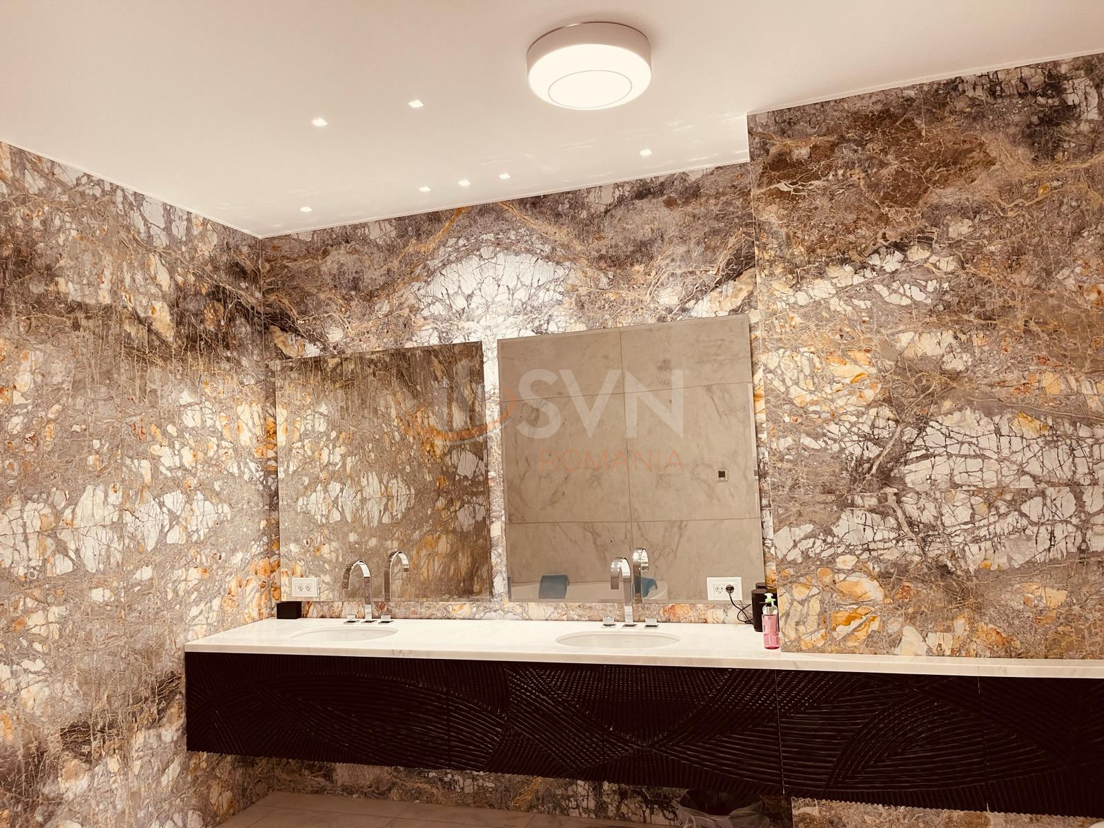 Candelabrele din sticla adauga un plus de stralucire si eleganta, de asemenea si peretii din marmura de carrara si pardoselile din piatra naturala.