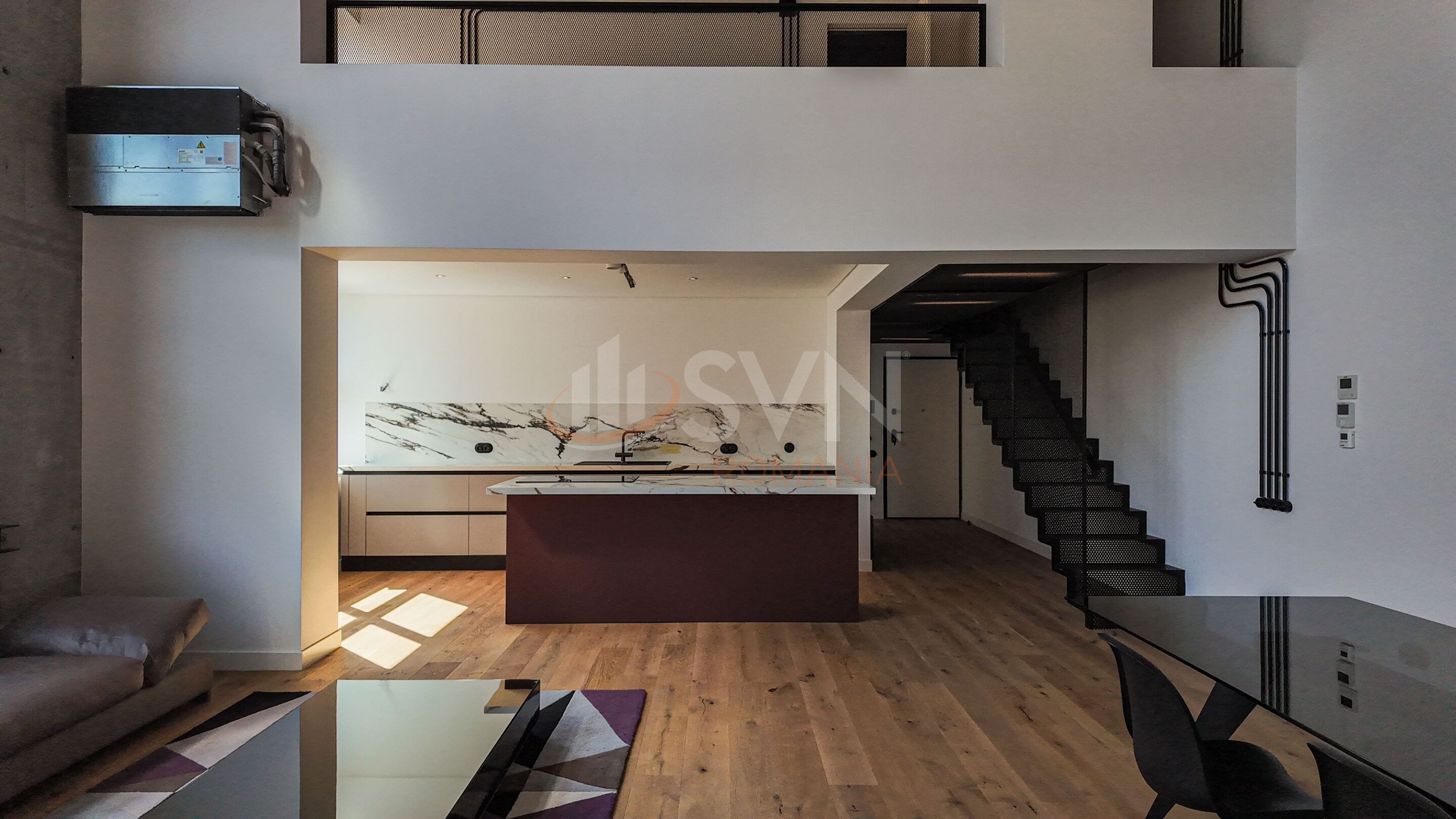 Loftul este generos spatios si luminos, cu ferestre ample ce permit luminii naturale sa inunde fiecare colt al incaperii. Designul open-space imbina perfect livingul, bucataria si zona de dining, creand un spatiu fluid si prietenos, perfect pentru relaxare si socializare.