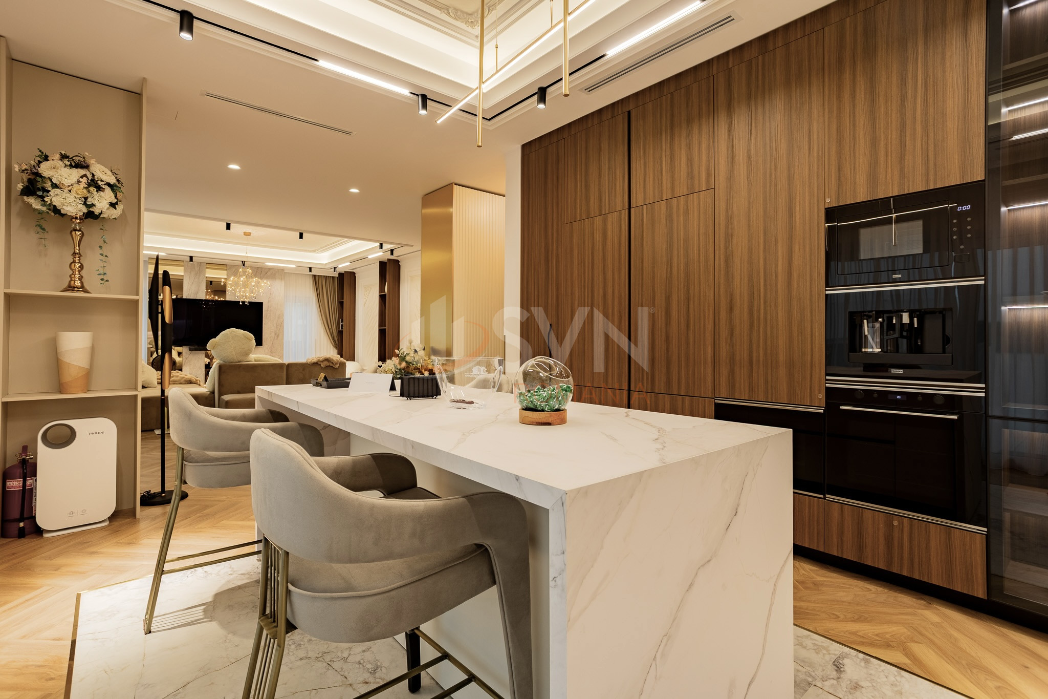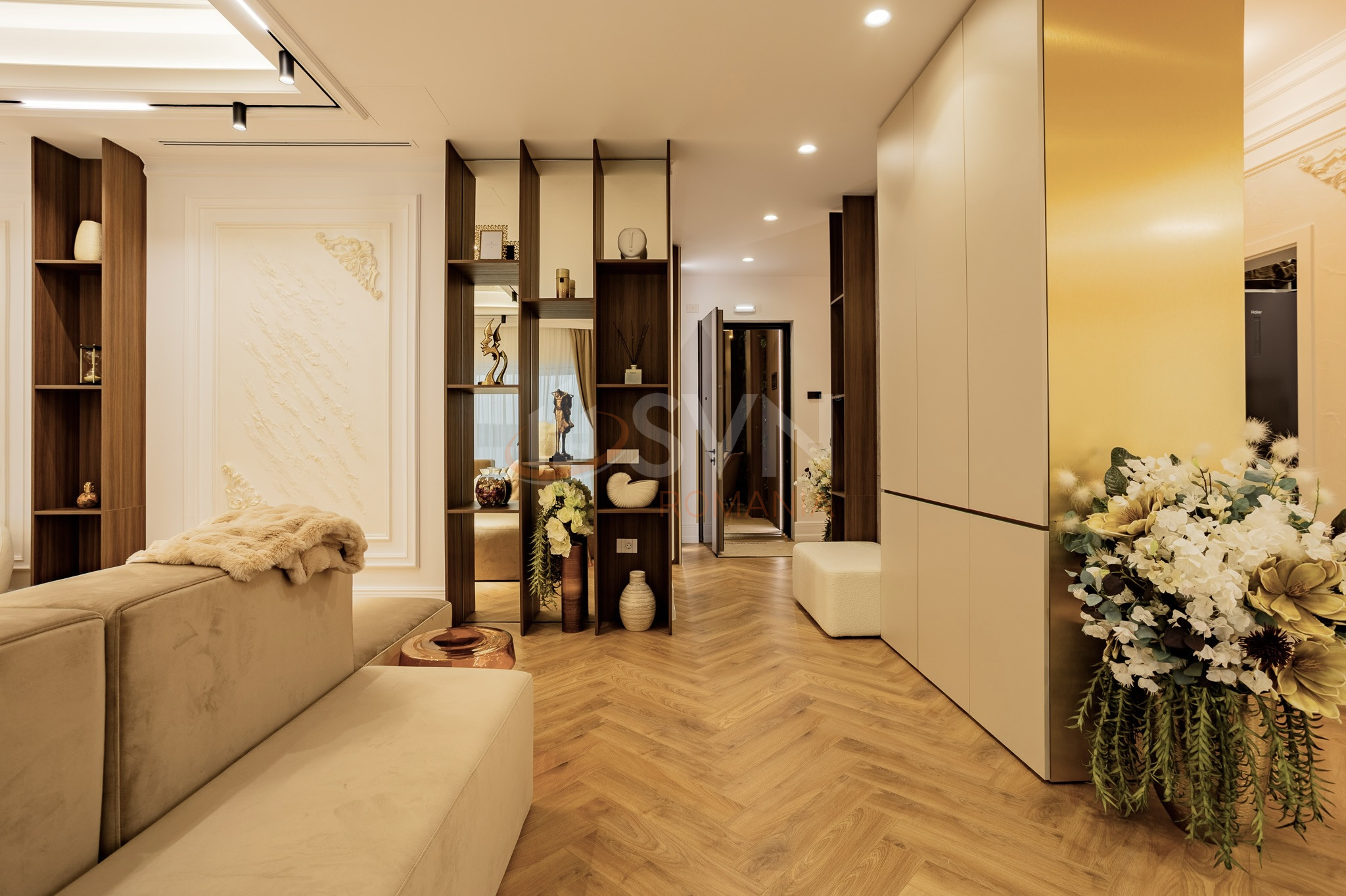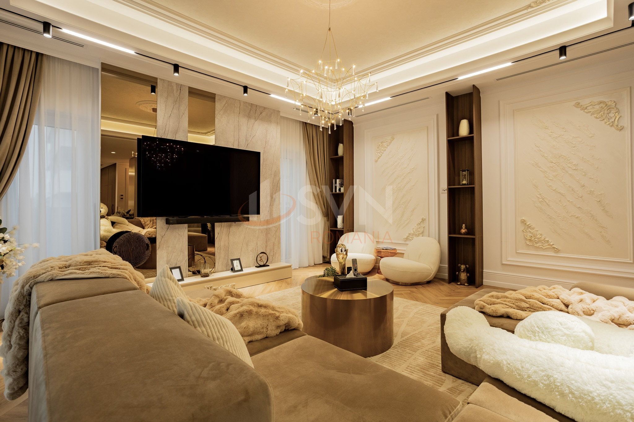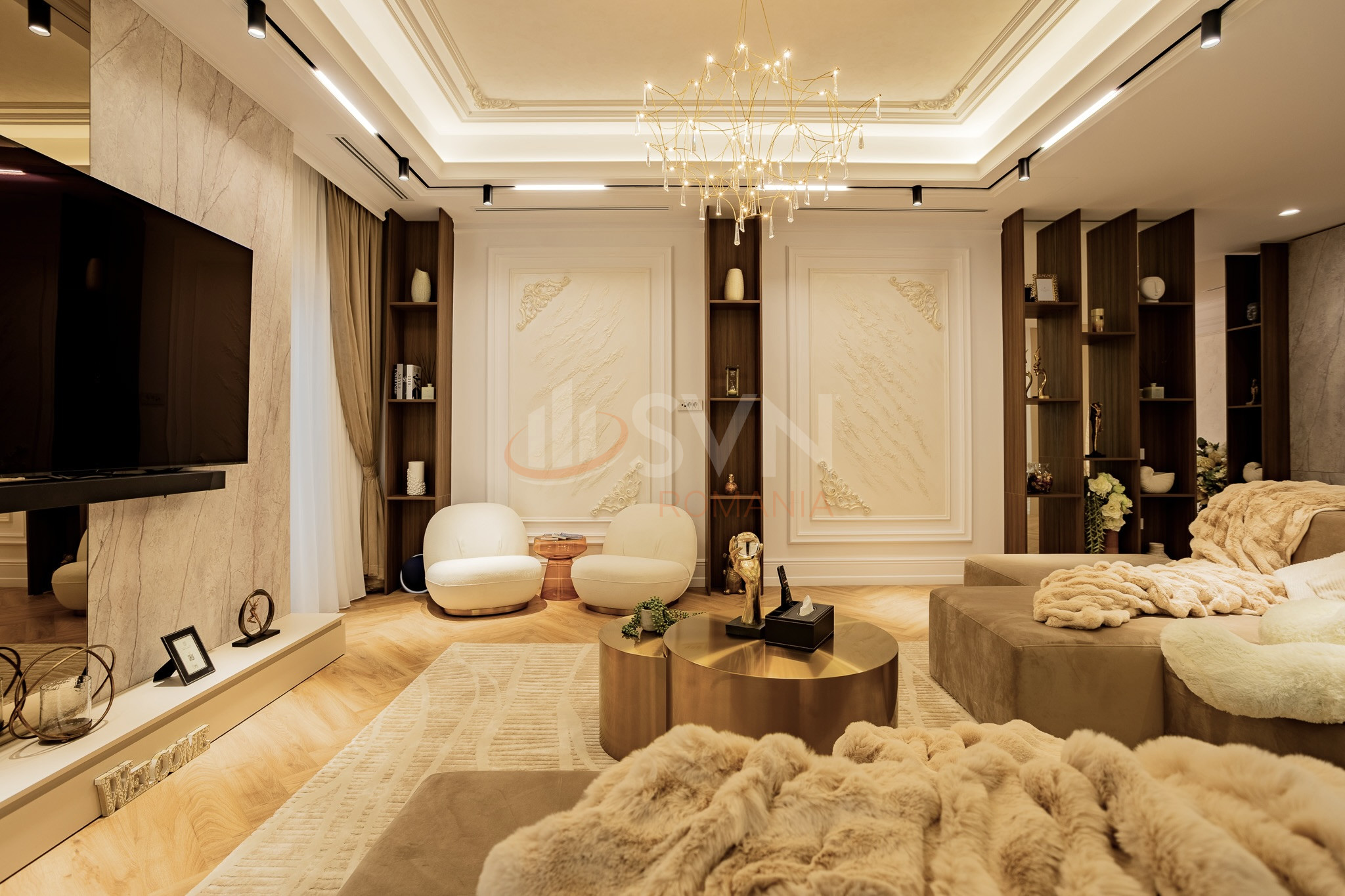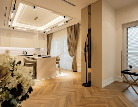 Apartamentul este finisat la standarde inalte, fiind placat cu ceramica, dispune de centrala proprie, incalzire in pardoseala, sistem de aer conditionat multisplit, tamplarie termoizolanta si obiecte sanitare premium. Finisajele interioare sunt realizate in tonuri neutre si elegante, oferind un ambient rafinat si confortabil.
