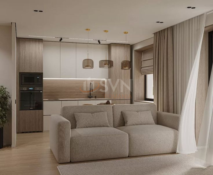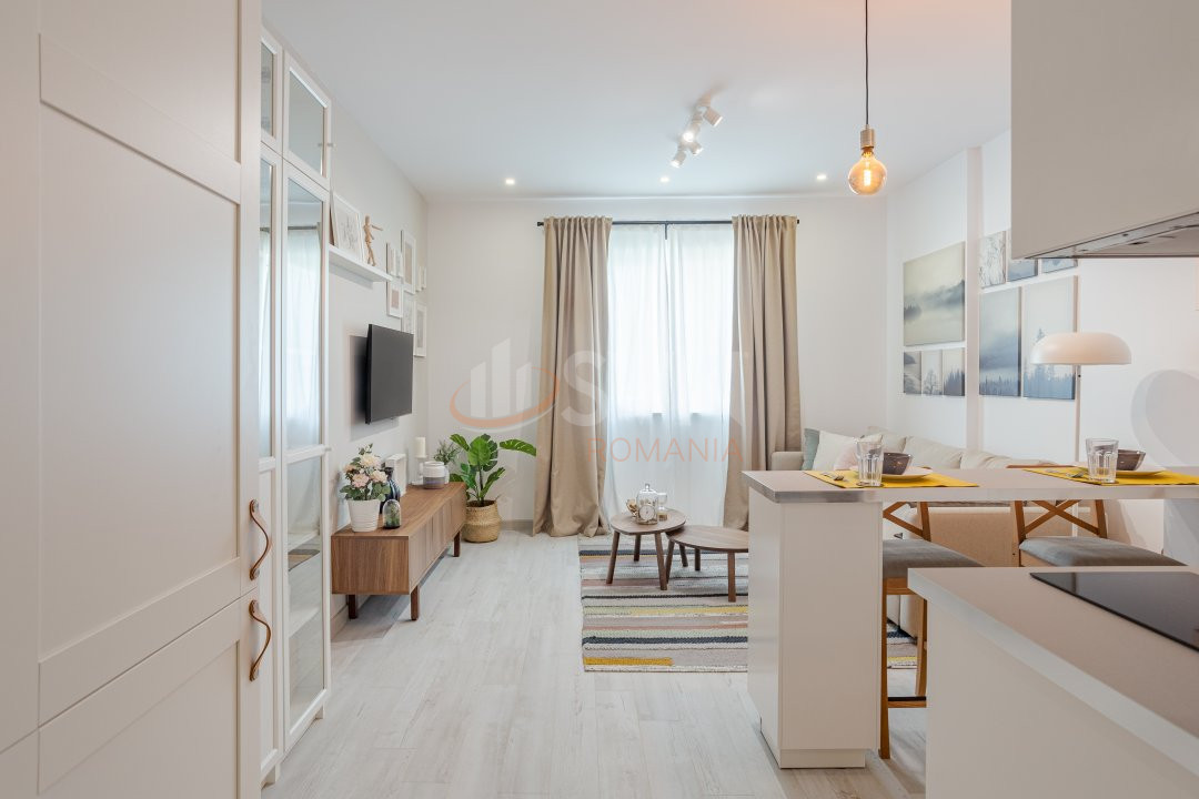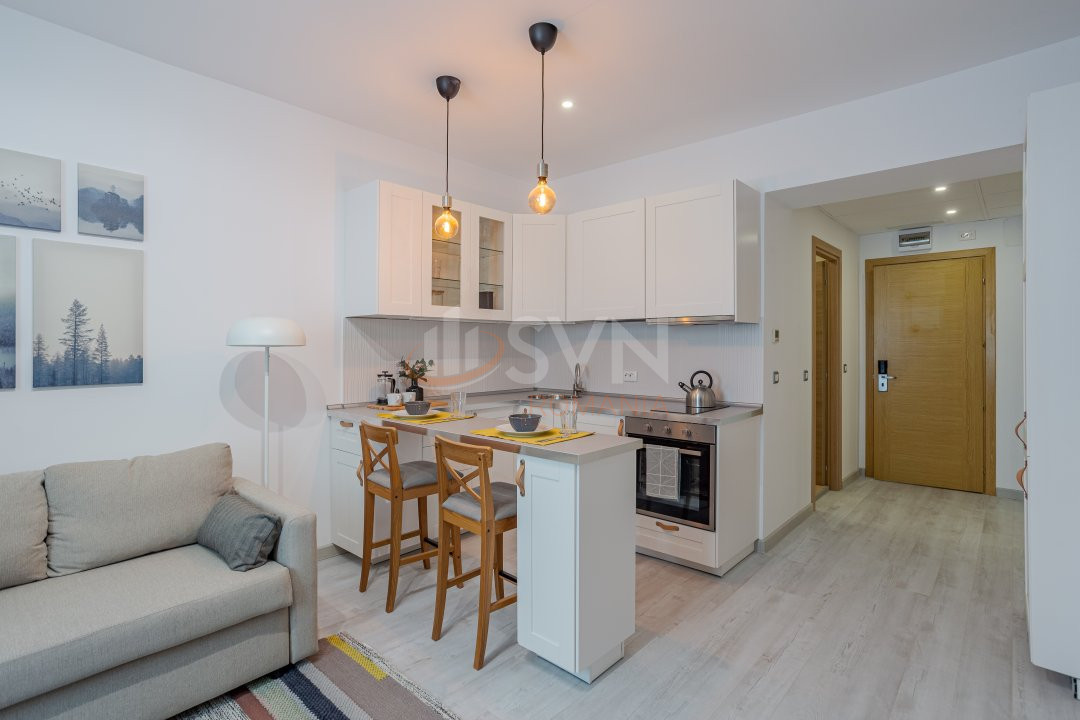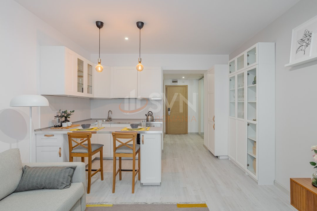 Studioul este format din living, bucatarie separata inchisa cu sticla, hol, baie, logie, toate insumand suprafata totala de aproximativ 42 mp.