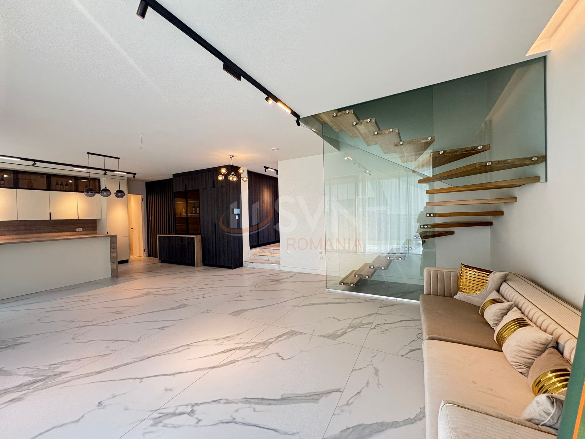 La etaj, vila pune la dispozitie 2 dormitoare si un dressing generos, asigurand confort si spatiu de depozitare. De la etaj, poti vedea intreaga zona de la parter, creand un design arhitectural modern si cursiv.