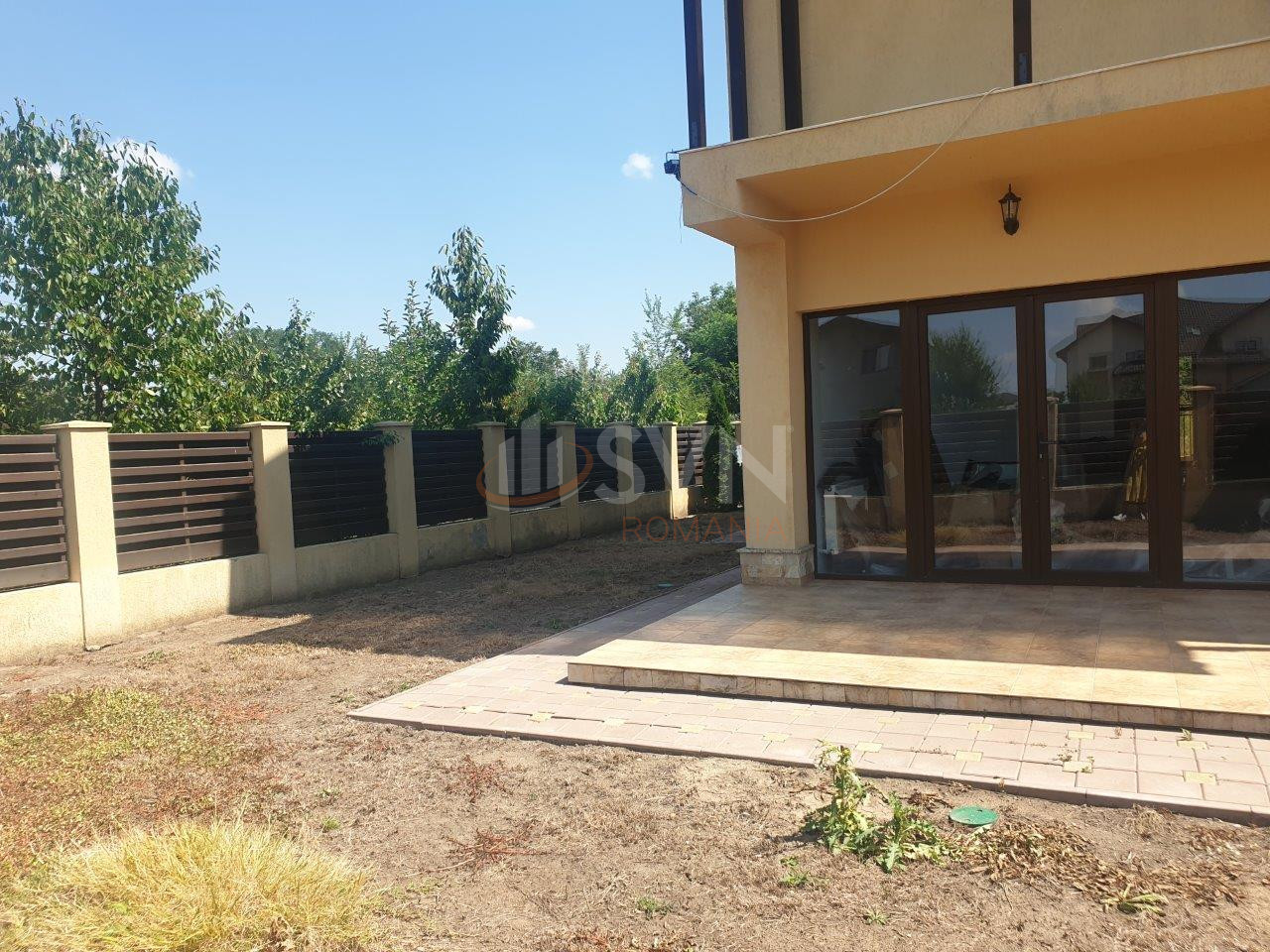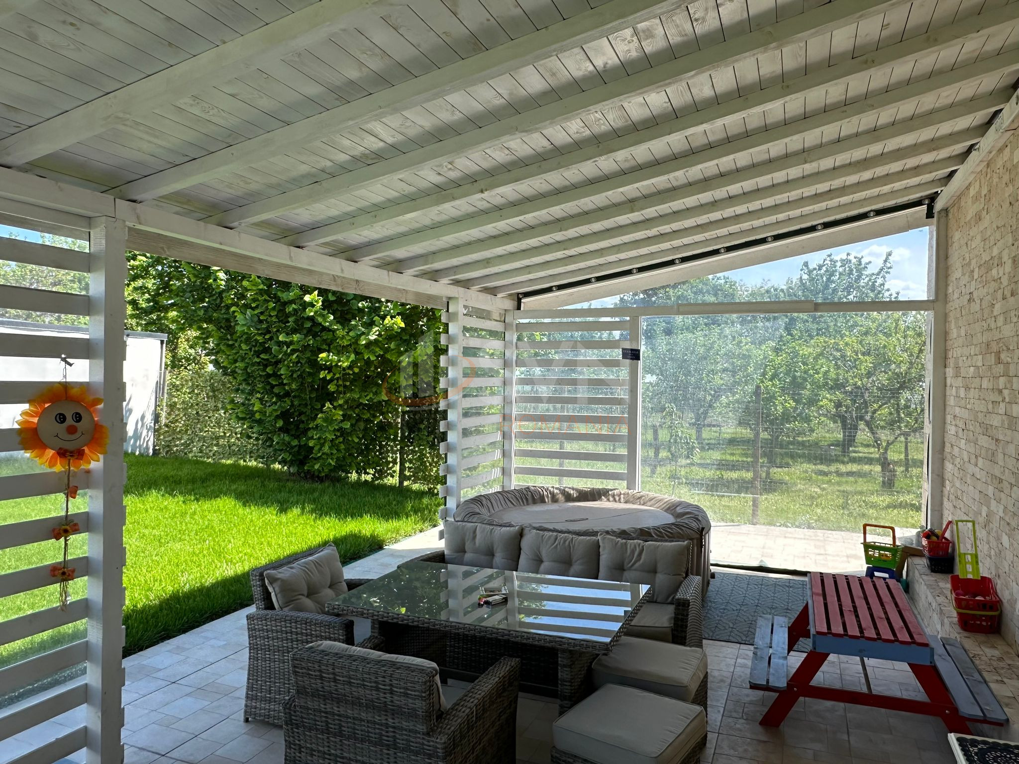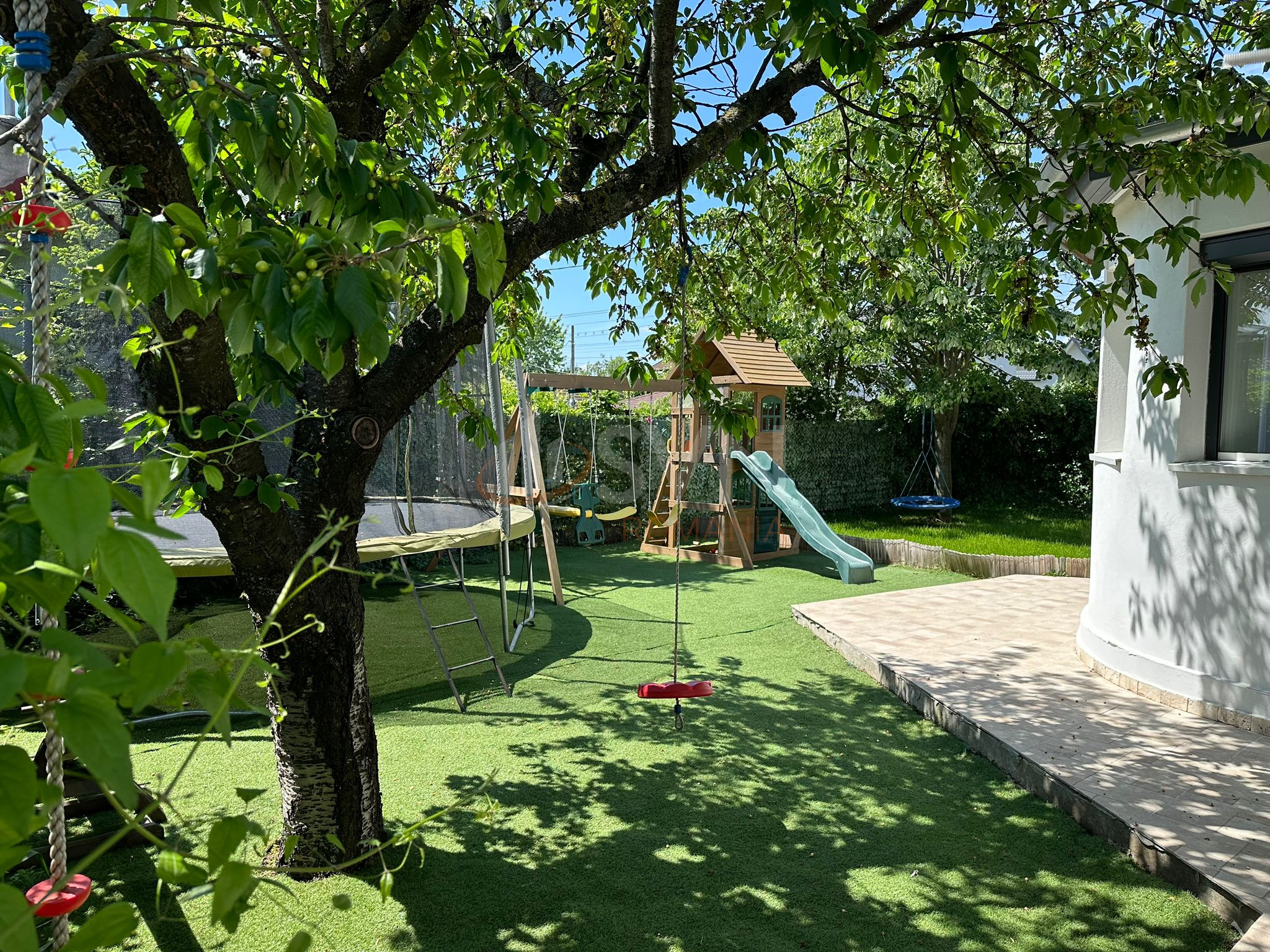 Curtea are suprafata de 1000 mp ,este amenajata cu pomi ornamentali ,flori si teren de badminton..