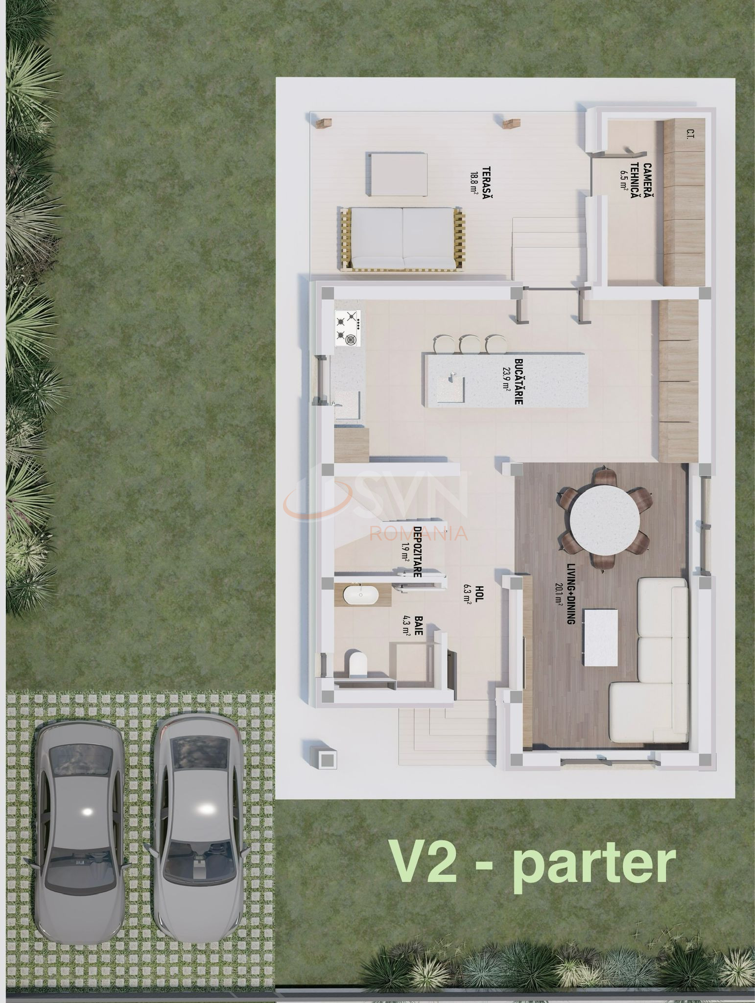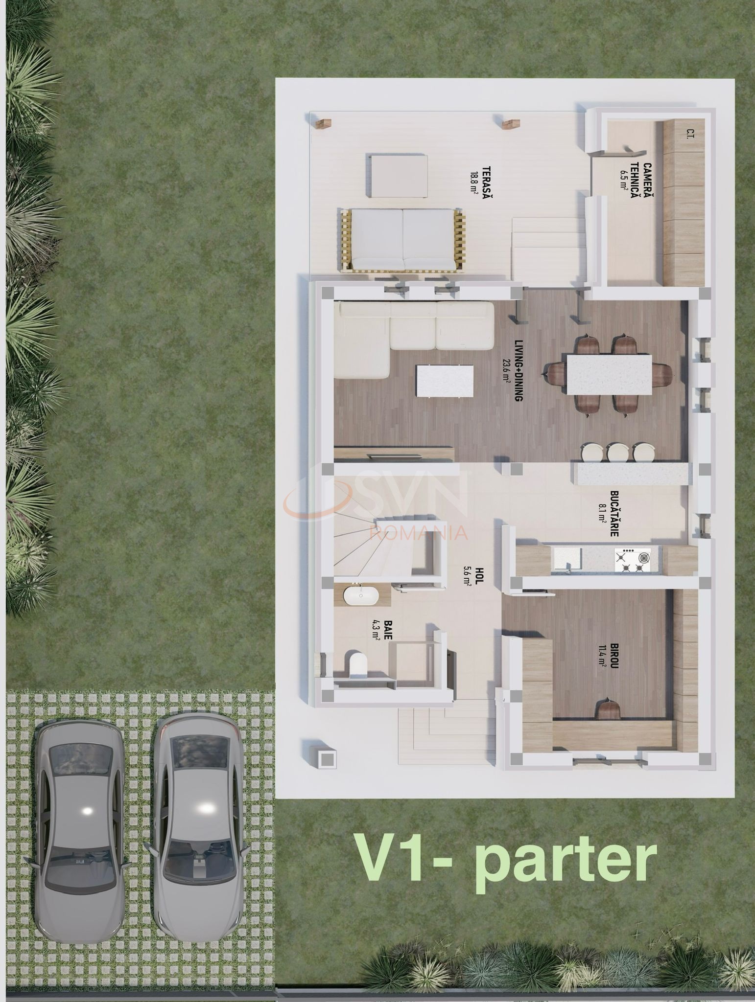 Parter: bucatarie open space, living spatios, debara si baie